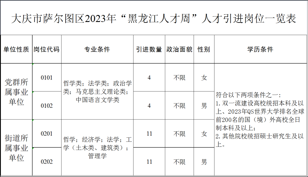 計劃引進黨群所屬事業(yè)單位工作人員8人,街道所屬事業(yè)單位工作人員22人,具體引進崗位、數(shù)量要求詳見《薩爾圖區(qū)2023年“黑龍江人才周”人才引進崗位一覽表》(見附件)。