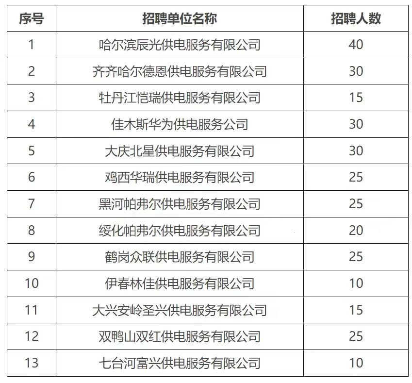 2024年黑龍江省各地供電服務(wù)公司共計(jì)劃招聘300人,招聘崗位全部為各供電服務(wù)公司鄉(xiāng)鎮(zhèn)供電服務(wù)一線技能崗位。各公司按照所屬地區(qū)進(jìn)行招聘,錄用后進(jìn)行二次分配,派駐至鄉(xiāng)鎮(zhèn)供電所從事委托業(yè)務(wù),具體需求如下: